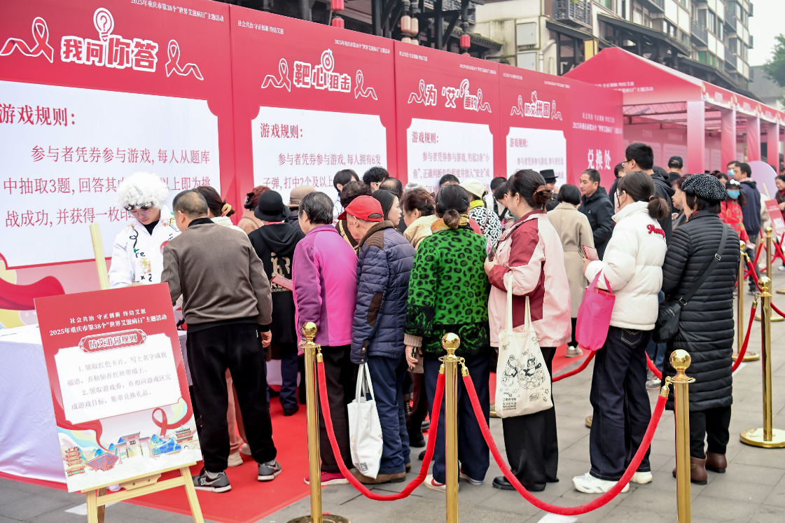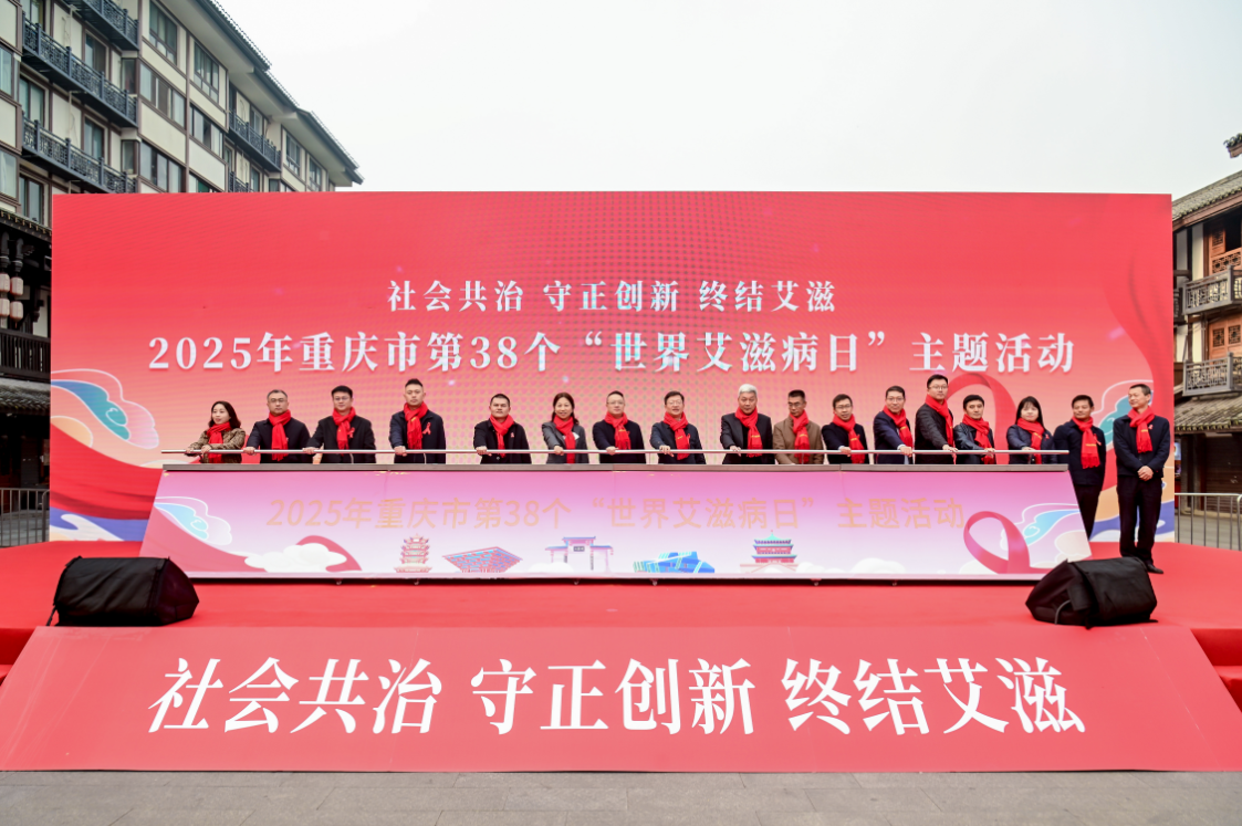 2025年12月1日,市卫生健康委、市疾控局、沙坪坝区人民政府联合在沙坪坝区磁器口老牌坊广场开展了重庆市第38个“世界艾滋病日”主题宣传活动,活动以“社会共治,守正创新,终结艾滋”为主题。重庆市人民政府办公厅副主任陶晓锋,市卫生健康委党委副书记、市疾控局党组书记、局长李畔,沙坪坝区人民政府副区长王晶出席活动启动仪式。市委宣传部、市委社工部、市教委、市公安局、市民政局、市司法局、市财政局、市市场监管局、市医保局、市总工会、共青团重庆市委、市妇女联合会、重庆海关等部门分管负责人,以及两江新区、沙坪坝区等6个重庆市艾滋病综合防治先行区疾控局相关领导一同参加了宣传活动。市疾控中心是本次主题活动的承办单位之一,中心党委书记黄邦成,党委委员、副主任唐啸出席现场活动。